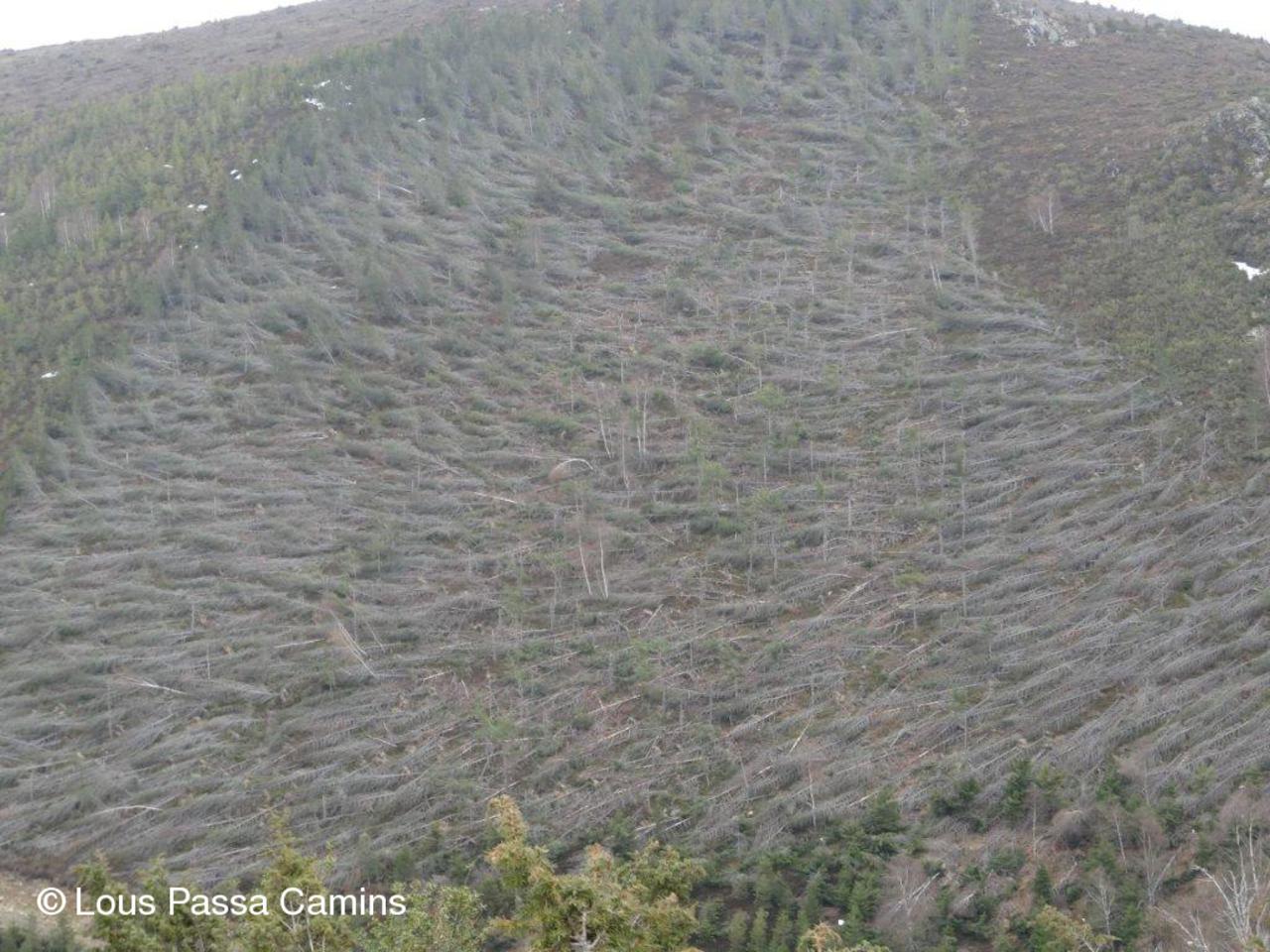 Les méfaits du vent sur une jeune plantation d'Epiceas : spectacle de désolation sur le deuxième plateau à 1400 m.