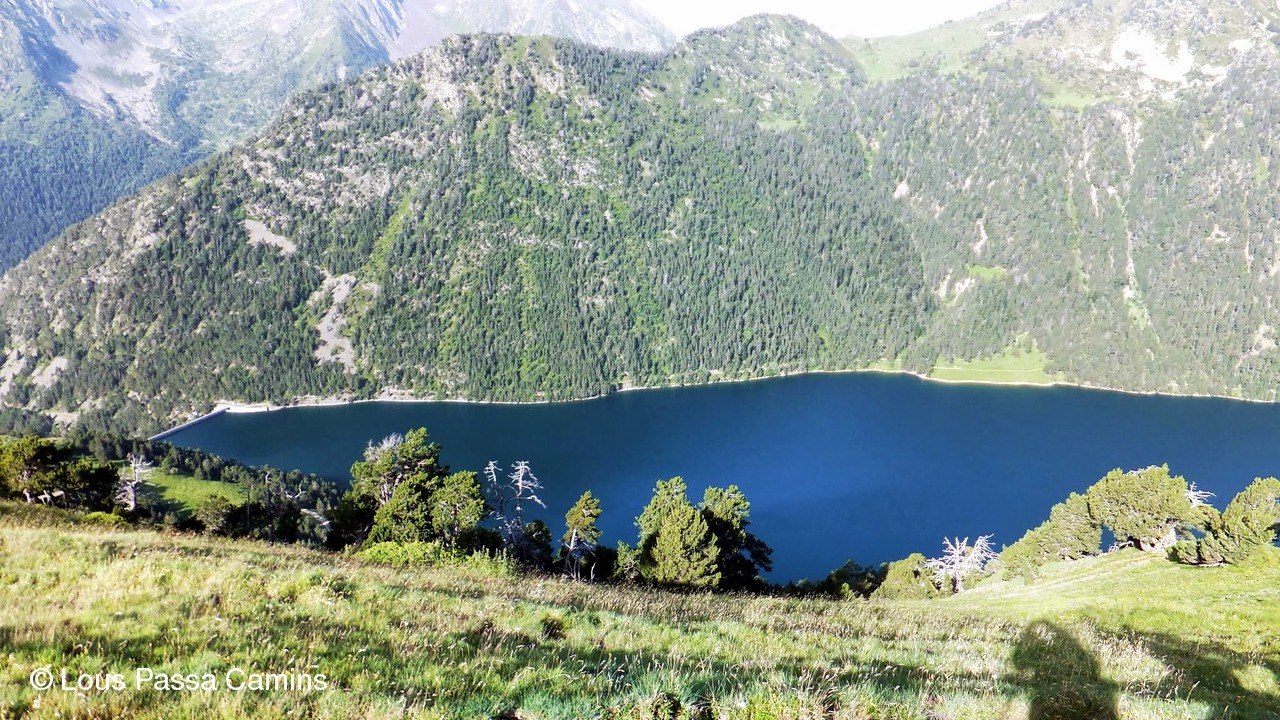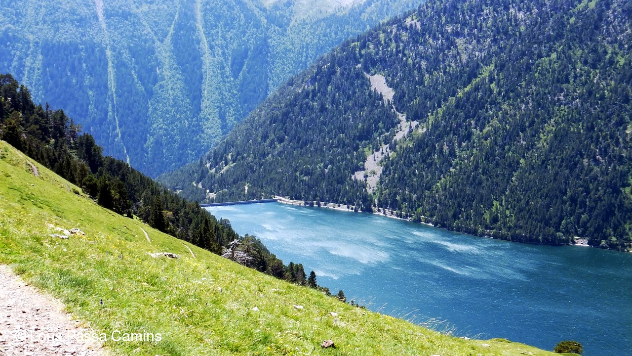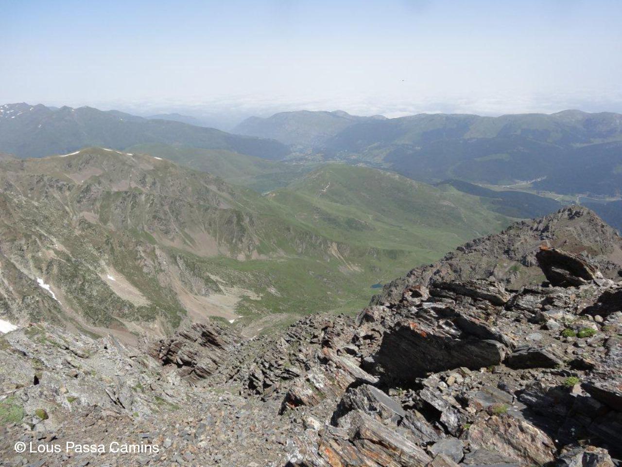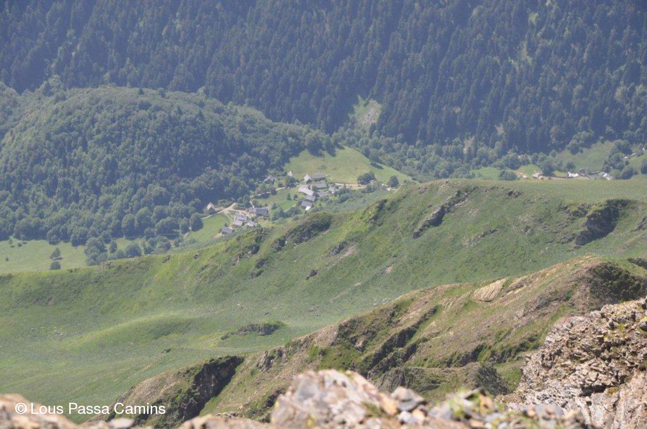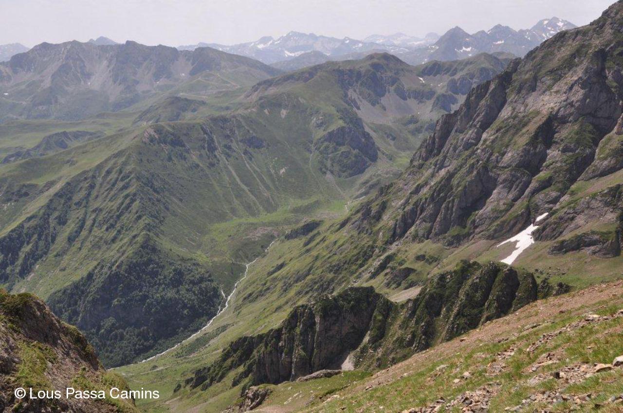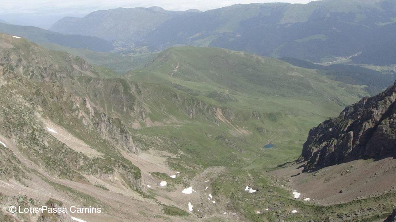 Vue de la Brèche vers Payolle. Le point bleu en bas est le lac d'Arou