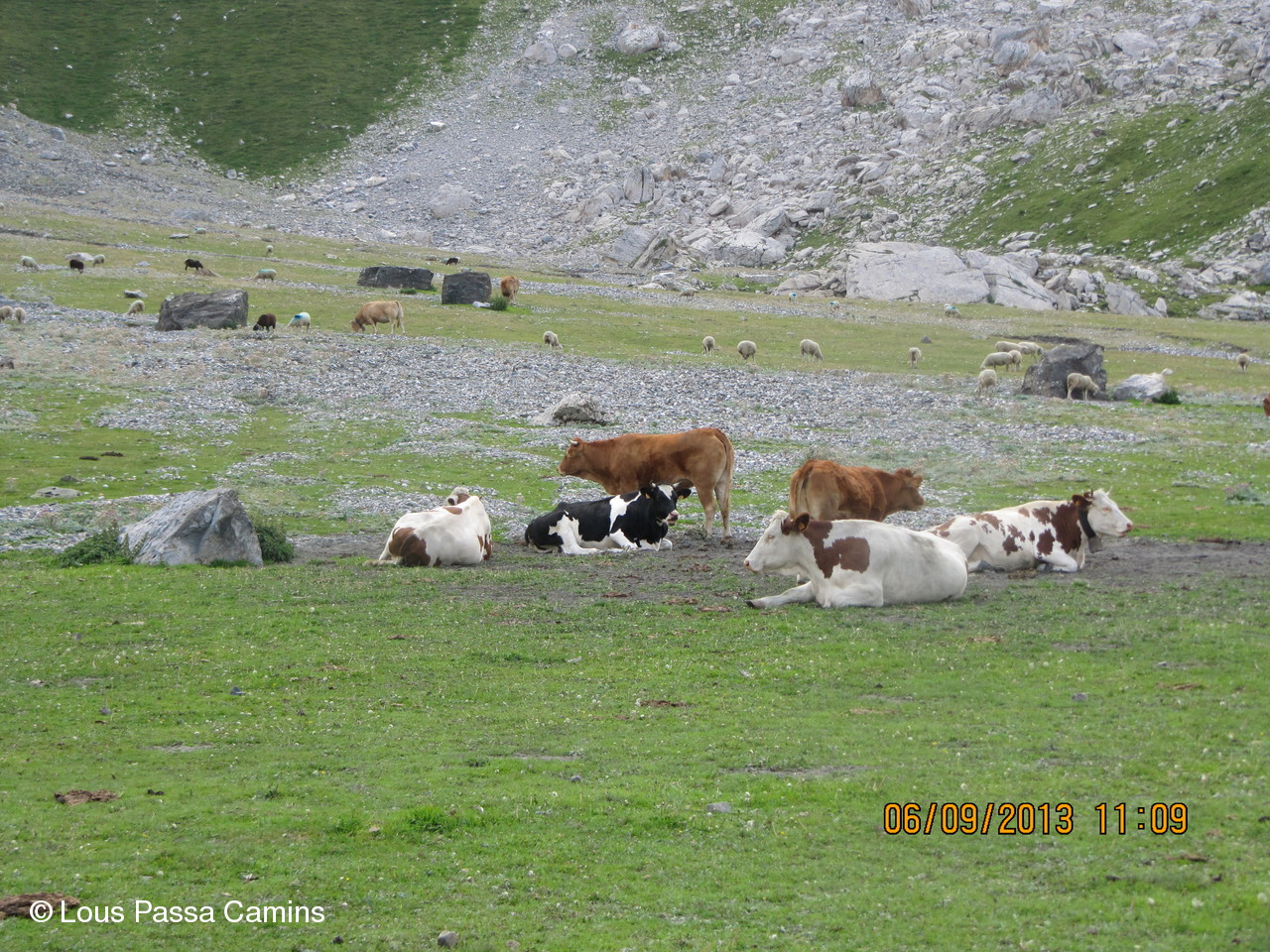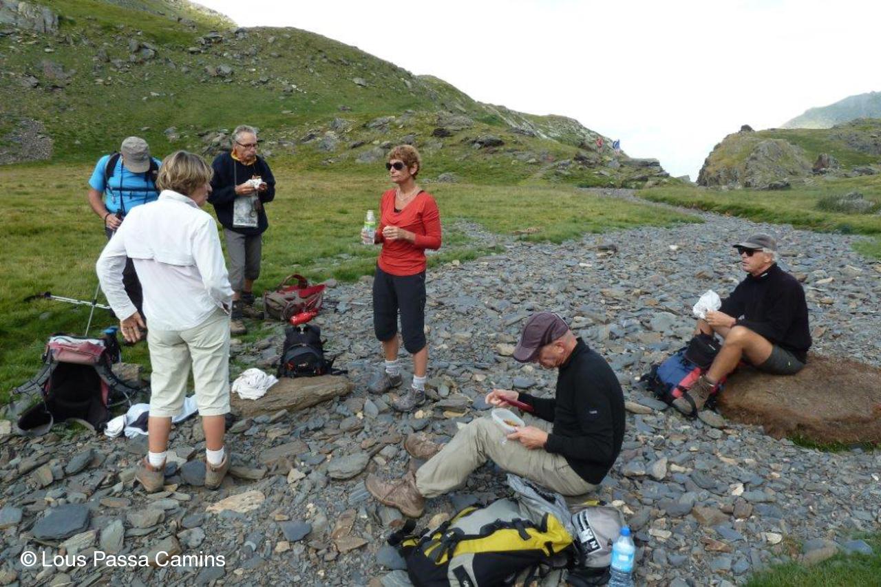 Halte régénératrice au dessous de la cabane des Aguilous.; dernier plan= le bord du ressaut d'où nous venons.