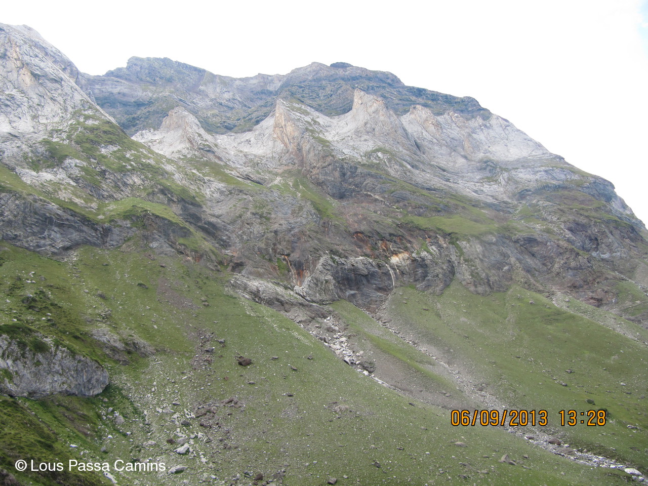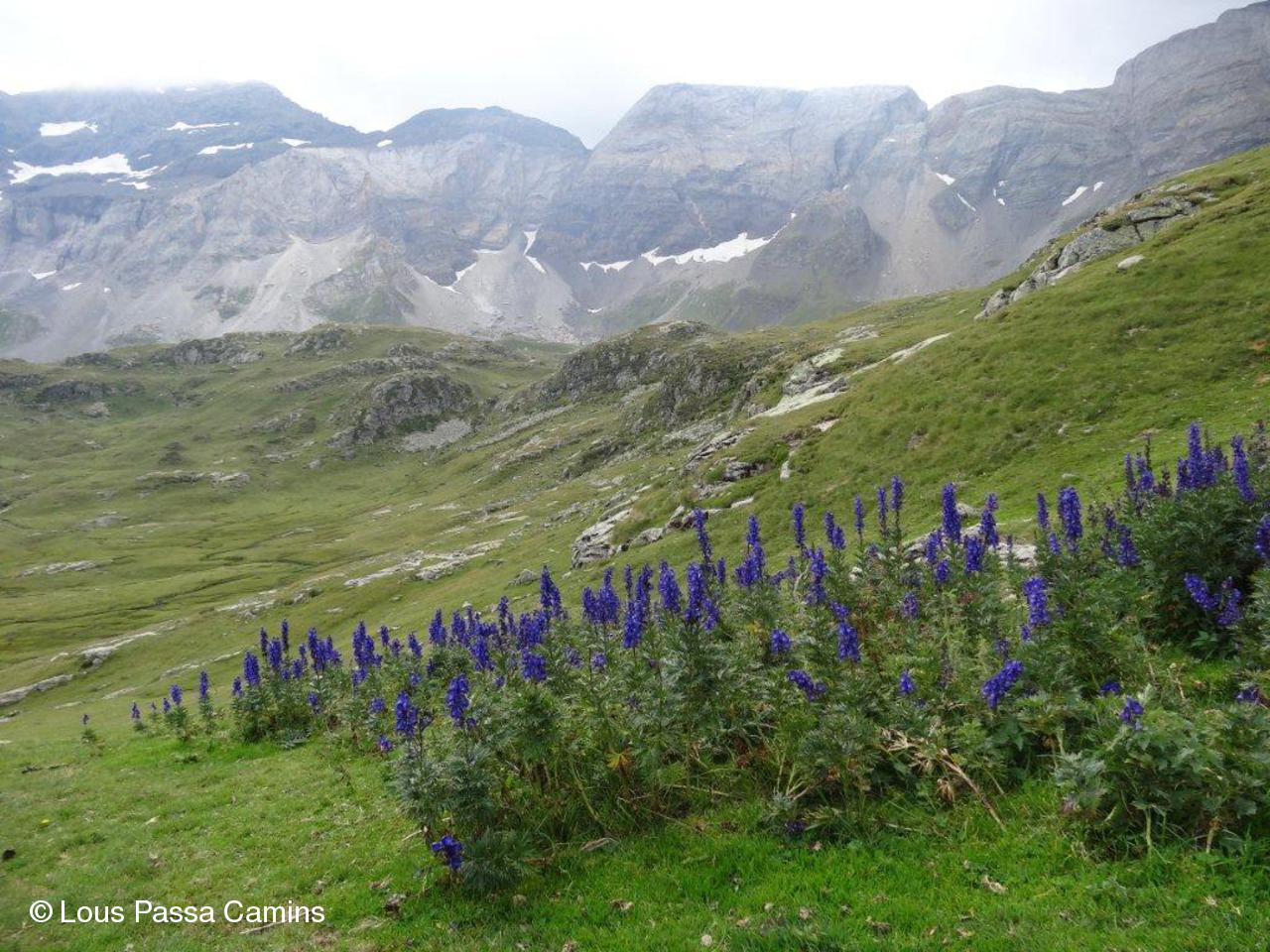 Du col de La Sède vers le cirque de Troumouse: vers la crête (sommets embrumés) on distingue au 1/4 G le couloir de la brêche de la clé du Curé, plus à G = le col de la Munia.