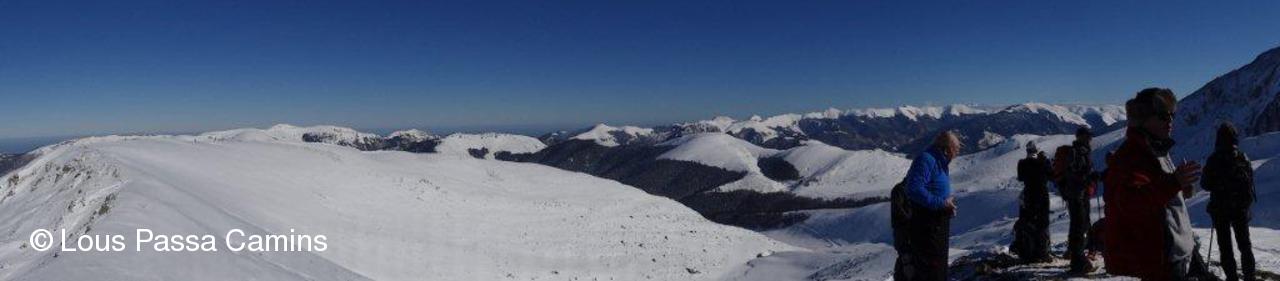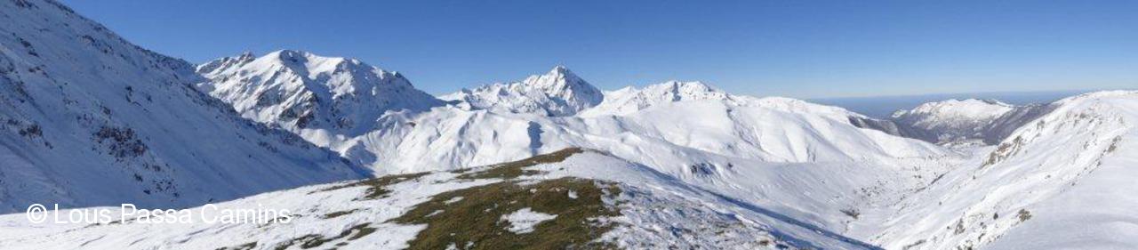 Le col de Crabe en haut à D; sur les flancs de la "crête de las Lourides" qui surplombent le vallon de l'Aoubère, des traces d'avalanche...