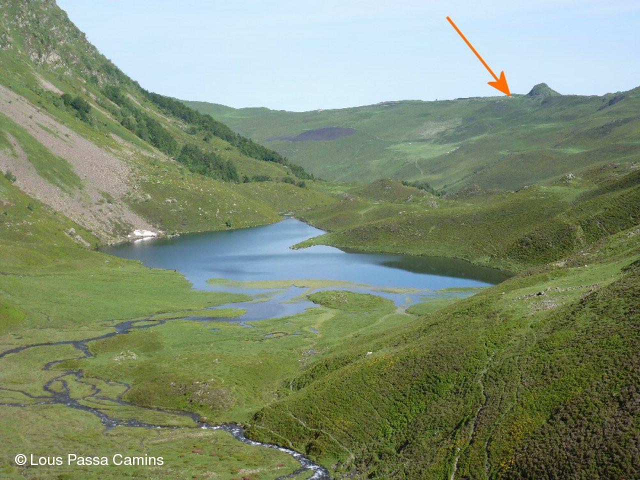Le lac d'Isaby; la flèche indique le P, au pied du pic de Naouit.