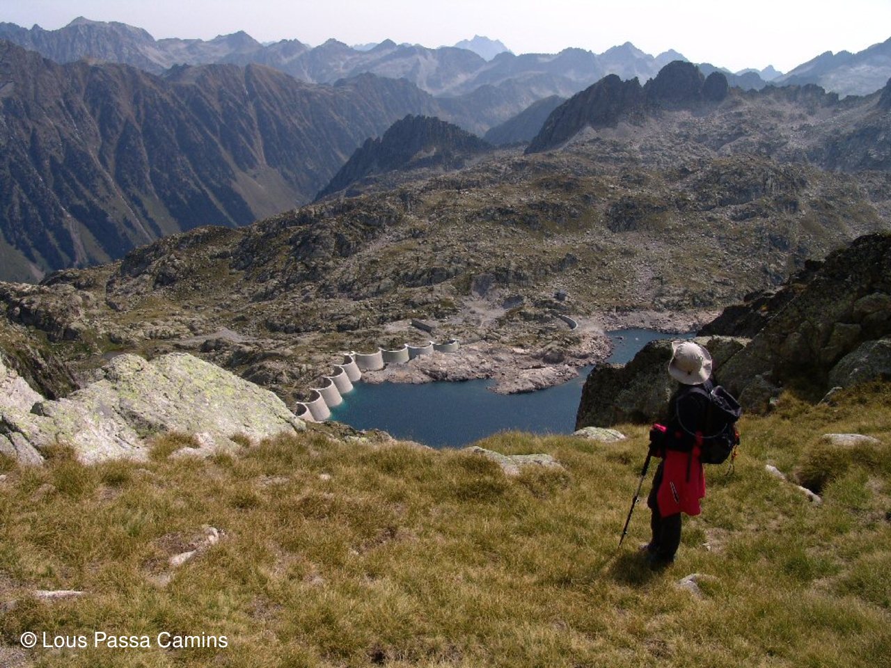 Descente vers le lac de Migouélou; au dernier plan = Balaïtous, pic de Batboucou, Palas