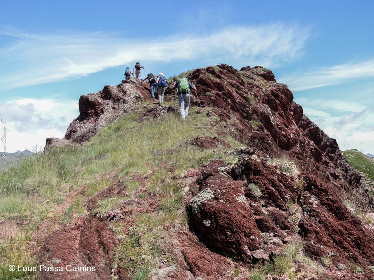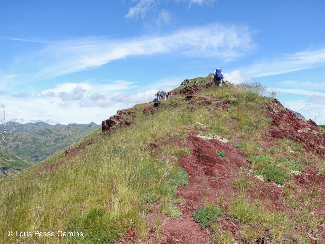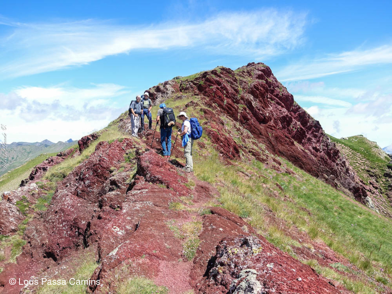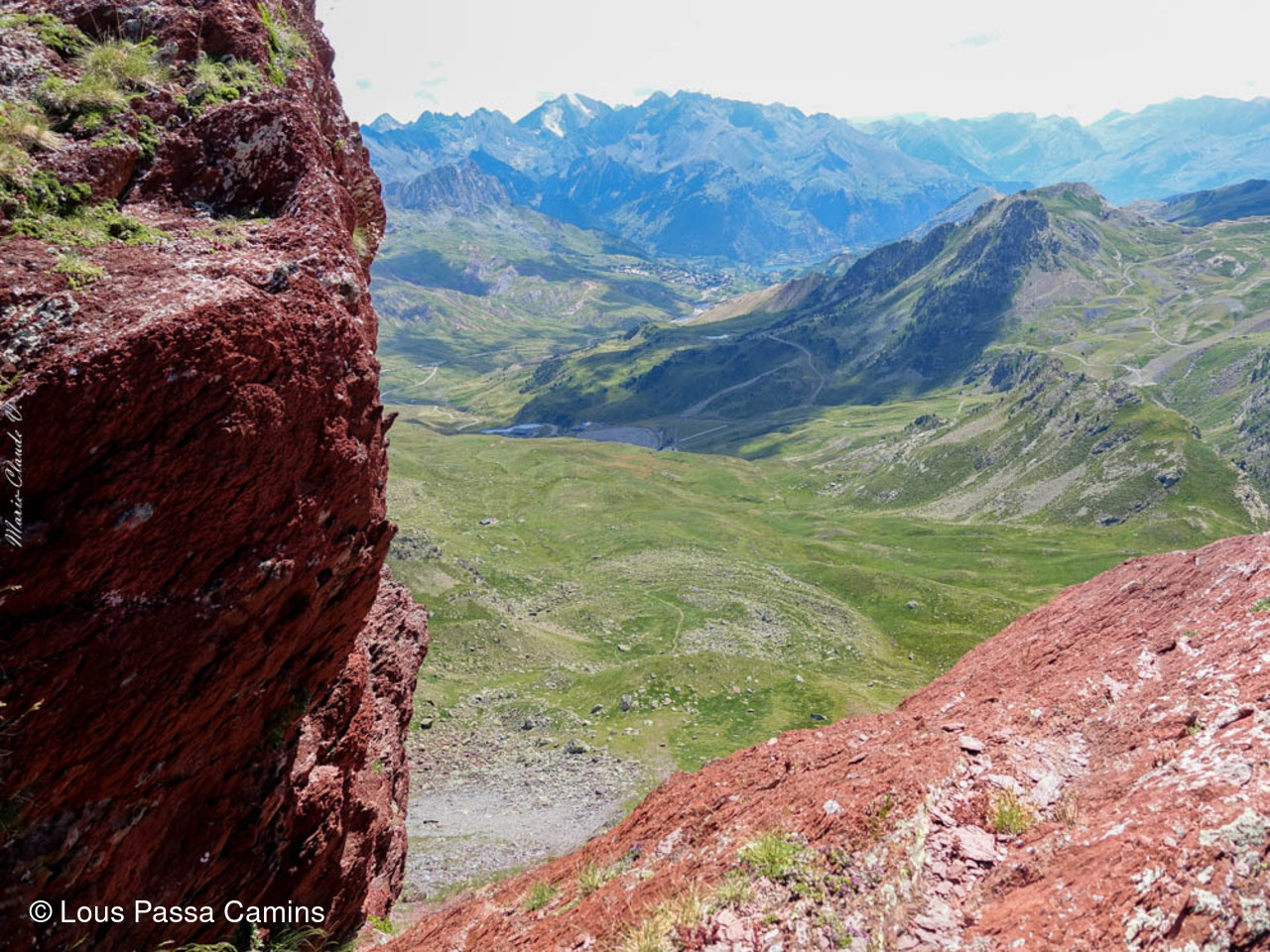 En rouge, second plan, les crêtes entre le vertice et le pic Arroyetas (une sortie G1...); les masses de calcaire gris au dernier plan: Pena Collarada et Pala de IP